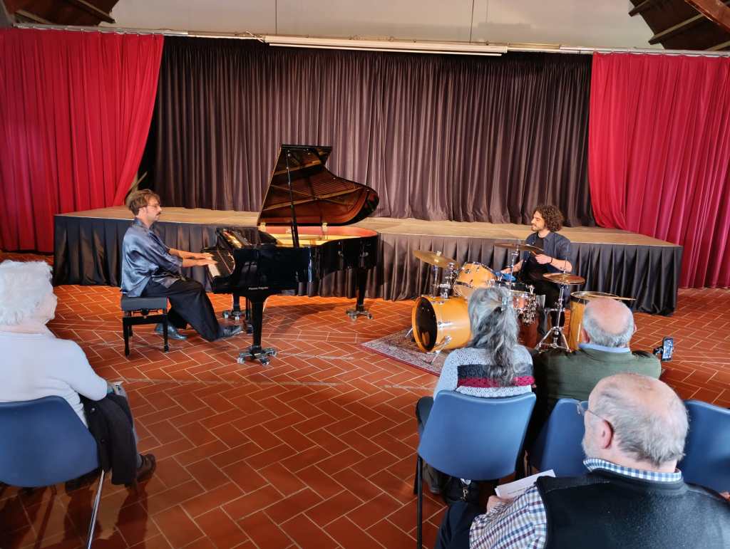 Piano, bateria i instruments de percussió diversos. Flamenc, jazz, música popular i alguns aires entre romàntics i clàssics. Com es poden combinar tots aquest elements per articular un discurs musical original i coherent? El duo GRACIAxDELACRUZ ens ho va demostrar aquest passat diumenge. Els dos músics integrants, en Guillem Gràcia (piano) i en Joaquín de la Cruz (percussió) parteixen de la base de l’estil flamenc per reconstruir-la en un llenguatge jazzístic que dóna cabuda a expressions del folklore andalusí i d’altres músiques d’arrels populars. En Guillem i en Joaquín ens van oferir un repertori de música pròpia que des dels primers compassos va generar un magnetisme absorbent per la seva frescor i energia. Les bulerías, alegrías i altres formats dels pals del flamenc que van interpretar, van inundar la sala d’unes sonoritats, colors i formes intensament atractives que van captivar el públic des del principi fins al final del concert.